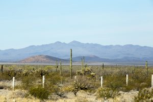 Vista panorámica del desierto de Sonora en Sonoyta con el escudo volcánico de El Pinacate y la silueta de su pico principal, el volcán cerro de Santa Clara